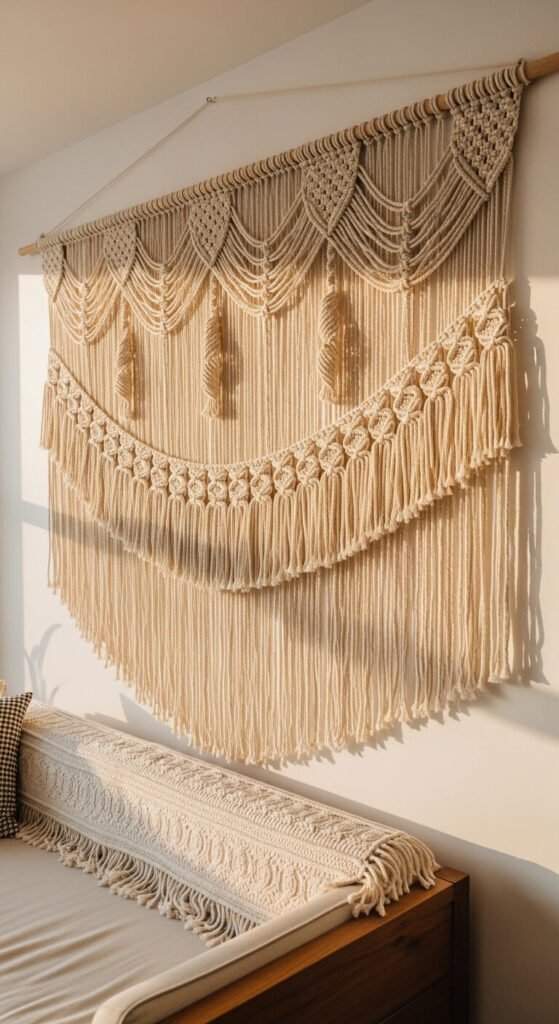 An oversized macrame wall hanging anchors a living room wall the way a large painting would — but with texture that changes with the light throughout the day. Go wider than feels comfortable: a piece spanning 60–80 percent of the wall width reads as intentional, not undersized. Natural unbleached cotton rope in 5mm thickness gives the heaviest, most dramatic fringe. Ready-made large pieces sell for $80–$180. A DIY version made from a $25 rope bundle and a wooden dowel costs a fraction of that. Pick one strong pattern — diamond, spiral, or chevron — and keep it consistent throughout the piece.