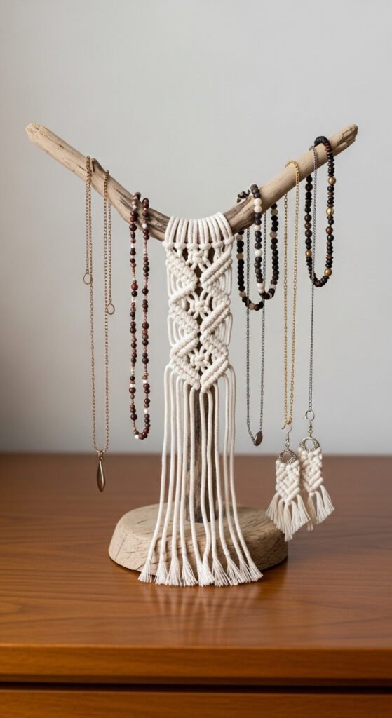 A macrame jewelry display stand keeps necklaces, bracelets, and earrings organized while functioning as a small decorative object on a dresser or vanity. Use a small branching piece of driftwood as the frame. Attach macrame cord sections between the branches to create hanging points. The short fringe at the base can hold earrings clipped on. The whole stand costs under $10 and takes about an hour to assemble. It is genuinely more functional than most purchased jewelry stands because the soft macrame cord does not tangle chains the way metal hooks and hard surfaces tend to.