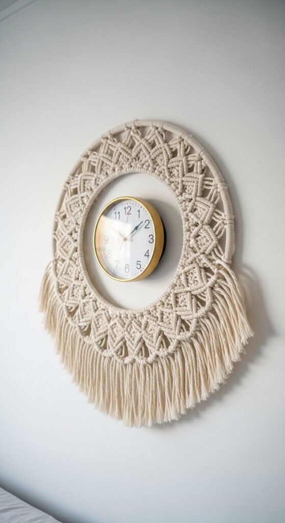 A macrame clock frame takes a standard wall clock mechanism and surrounds it with handmade knotwork, turning a functional object into wall art. Buy a basic clock insert from a craft store for $8–$12. Build a macrame circular frame around it using a wrapped metal ring as the outer border. Attach knotted cord between the ring and the clock to fill the frame. Add fringe to the lower half for asymmetric texture. The full project costs under $25. This is a clever way to display something useful — a clock — in a way that looks like intentional bohemian decor rather than a generic wall fixture.