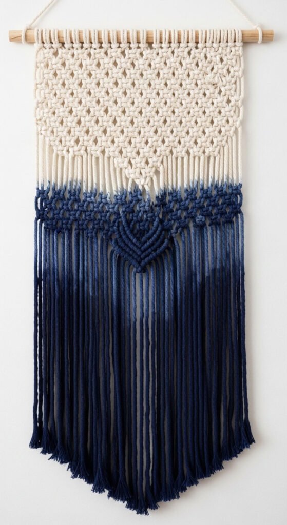 A dip-dyed macrame wall hanging adds striking visual contrast to a standard knotwork piece. Complete the full hanging in natural cotton rope first. Then dip the lower fringe and final knotted rows into a bucket of fabric dye — indigo, terracotta, or charcoal are the most dramatic choices. The color naturally fades upward as dye absorption decreases, creating a gradient that looks deliberate and professional. Fabric dye costs $5–$8 per color. This is a 30-minute finishing step that transforms a plain hanging into something with real visual punch. No additional knotting skill required.
