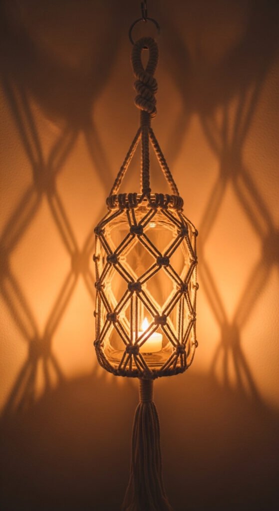 A macrame hanging lantern encases a glass jar in a knotted cotton rope cage and suspends it from a ceiling hook or curtain rod. The gaps in the rope cage allow warm candlelight to spill outward, casting soft patterns on nearby surfaces. The jar sits inside the rope without glue or hardware — the knotwork holds it securely from below. Use a battery-operated tea light for a no-flame option. A single hanging lantern costs under $10 in materials and takes about 45 minutes. Group three at different heights from a single ceiling hook for a chandelier-like cluster effect.
