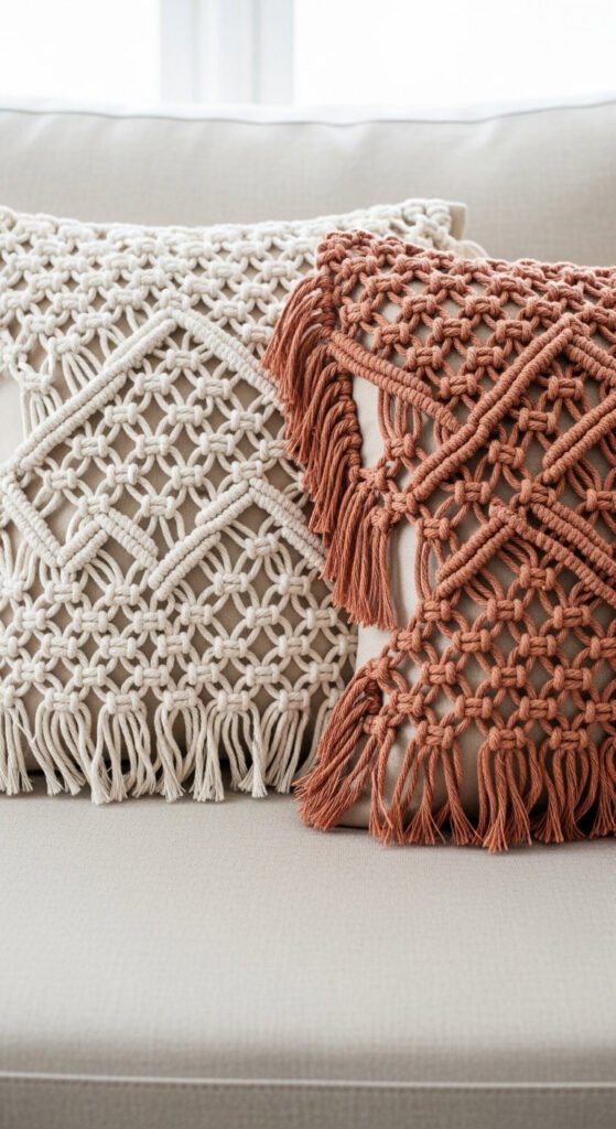 A macrame fringe pillow cover wraps a standard pillow insert in handmade knotwork. Work a diamond or square knot panel to the size of the pillow front. Attach it to a plain backing fabric — linen or cotton — with a zipper or envelope closure. The knotwork front faces outward; the plain fabric back sits against the sofa. The cotton rope for a 20-inch pillow front costs about $12. Ready-made macrame pillow covers sell for $30–$60. A pair of these on a plain sofa shifts the entire character of the seating area toward something warmer and more handmade.