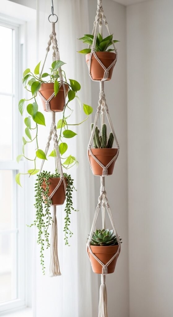 A five-tier macrame planter tower displays five plants in vertical space rather than spreading them across a floor or shelf. Each tier is a simple knotted pouch that cradles a small terracotta pot. The rope sections between tiers use square knots or spiral patterns. The whole structure hangs from one ceiling hook. Materials cost $20–$30 for a five-tier version. This is a great project for small apartments where floor space is limited but ceiling height is available. Five different plant varieties at five different heights create a vertical garden effect that would require a full shelf unit to replicate any other way.