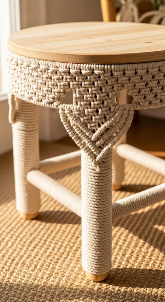 A macrame-wrapped wooden stool transforms a plain flat-pack stool into a textured boho accent piece. Wrap each leg tightly with 5mm cotton rope starting from the floor upward, securing the cord at top and bottom with a simple overhand knot and dab of craft glue. Add a decorative knotted section just below the seat for a more deliberate finish. A plain wooden stool costs $15–$25; the rope costs $10–$15. The finished piece works as a plant stand, a side table, a footrest, or simply as a decorative object in a corner. The wrapping takes about two hours per stool.