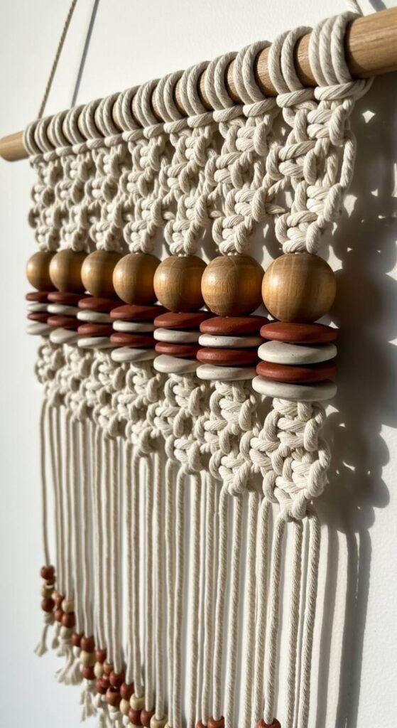 A beaded macrame wall hanging uses wooden or ceramic beads threaded onto the rope before or during the knotting process. The beads interrupt the knot rows and add color, weight, and a different material texture to the piece. Large round wooden beads cost $8–$12 for a pack of 20. Flat ceramic disc beads in earthy tones are slightly more — $10–$15 per pack. Thread them onto individual cord strands and continue knotting above and below to lock them in place. A beaded hanging has more visual complexity than plain knotwork and takes minimal extra skill to produce.