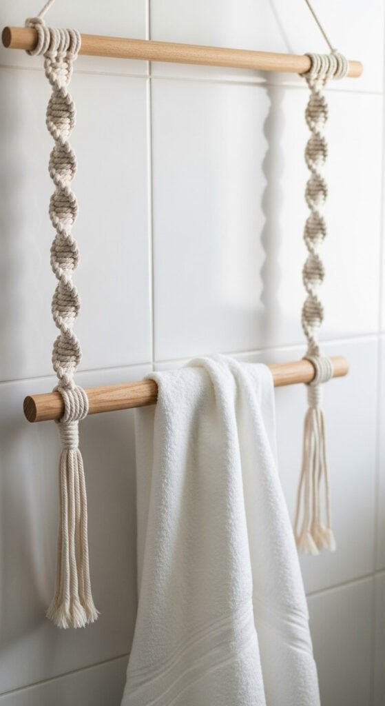 A macrame towel holder replaces a standard chrome bar with something that has texture and a handmade character. Two vertical rope sections, each anchored to the wall with a small screw hook at top and bottom, support a central wooden dowel from which a hand towel or larger bath towel hangs. The rope can be worked in a simple spiral knot or left as clean twisted cord. Total materials cost under $15 — a wooden dowel, two short lengths of 10mm rope, and four small hooks. Mount at the right height for the towels you plan to hang. Practical, affordable, and genuinely attractive.