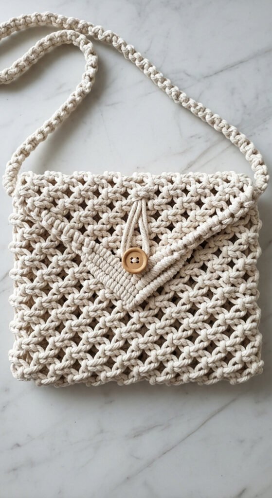 A macrame clutch bag is a small, practical accessory that can be made in an afternoon. The body is a flat rectangular panel of tight diamond knots — firm enough to hold its shape and light enough to carry comfortably. A wooden button loop closure adds a finished, intentional detail. A thin twisted cord forms the strap. The cord for a standard clutch size costs under $10. Working in 3mm or 4mm single-strand cotton cord gives the tightest, most durable result. This is a practical weekend project that produces a genuinely usable bag — not just a decorative object to hang on a wall.