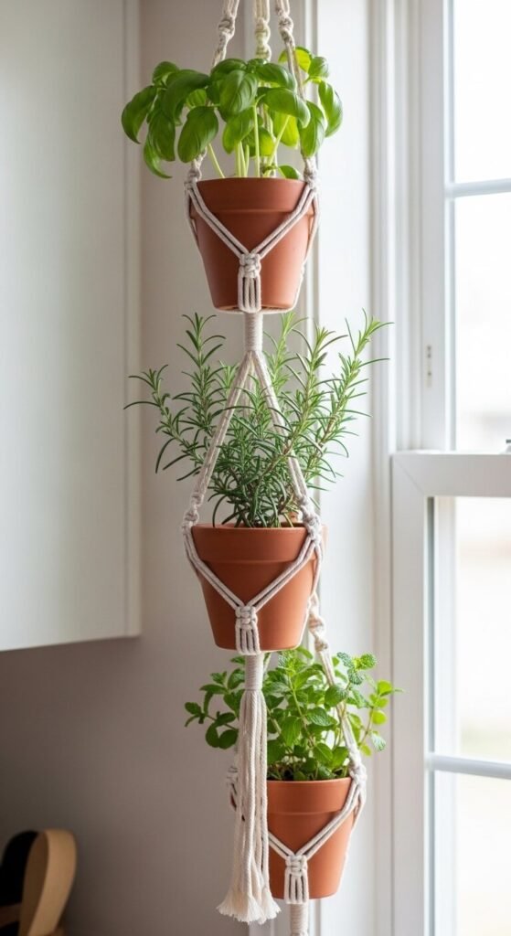 A macrame hanging herb garden keeps fresh herbs accessible in a kitchen without taking up counter or windowsill space. Three individual knotted holders — each large enough for a standard small terracotta pot — hang vertically from a single mounting point. Plant basil, rosemary, mint, or thyme in each pot. The full structure costs under $15 in cord. Mount beside a kitchen window where the herbs get good light. Water carefully — use saucers inside the rope holders to catch drainage. This piece combines daily practical use with a handmade decor detail that most kitchens completely lack.