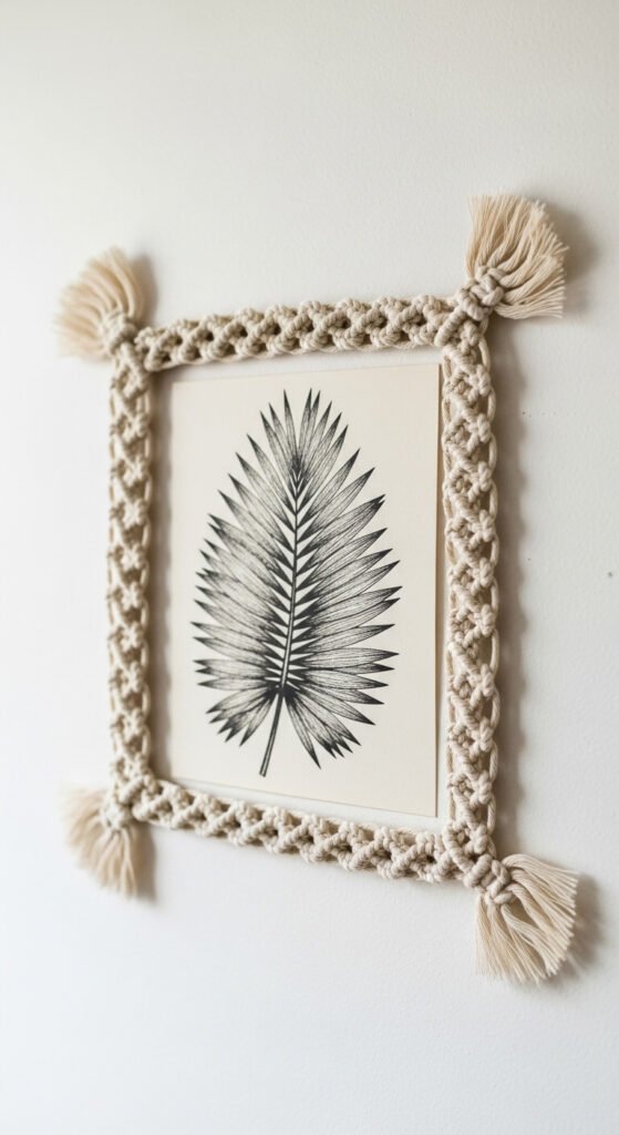 A macrame-framed botanical print pairs a printed or hand-drawn botanical image with a knotted cotton rope border to create wall art that bridges printed and handmade aesthetics. Build a simple rectangular frame from four sections of square-knotted rope joined at the corners. Add small fringe tassels at each corner. Mount a botanical print inside the frame using small clips or hidden tape. The rope frame costs under $10 in cord. Print a tropical leaf or pressed flower image at home for under $2. The finished piece looks like something from a boutique home store and costs about $12 total.