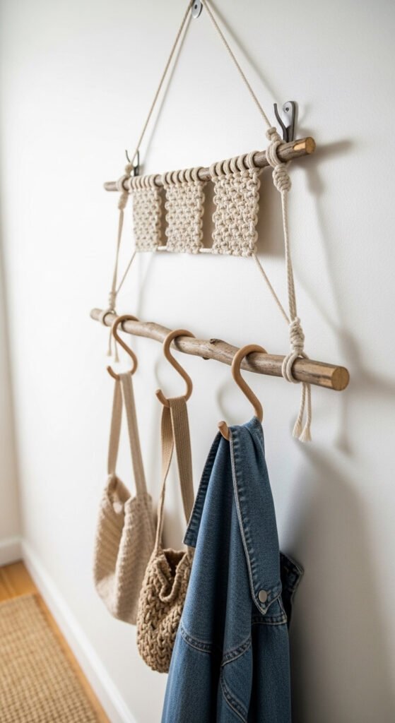 A macrame coat rack suspends a natural wooden branch from two knotted rope hangers, creating a functional entryway piece that looks entirely handmade. Work a short section of square knots above the branch on each rope. Add simple S-hooks along the branch for hanging coats, bags, and hats. The branch can be foraged from a garden or purchased at a craft store for $5–$8. The rope costs about $10. Add a small shelf bracket below the branch for keys. Total cost under $25. This is one of the most practical macrame projects in the guide — used every single day, noticed every time.