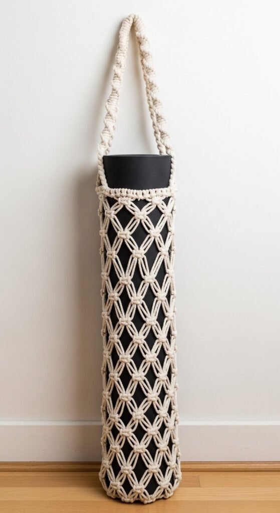 A macrame yoga mat carrier is a practical accessory for anyone who takes a mat to a class or outdoor practice. The open diamond knot pattern forms a long tube that holds a standard rolled yoga mat snugly. Thick twisted rope handles make it comfortable to carry. The full carrier uses about 30 meters of 5mm cotton cord and costs under $15 in materials. It takes three to four hours to complete. This is a functional project that replaces a plain nylon or canvas mat bag with something handmade — and the open weave lets the mat air out between uses, which flat bags do not.