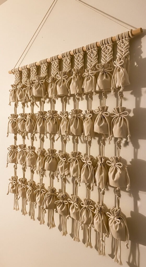 A macrame gift calendar hangs on the wall as both a gift delivery system and a seasonal wall decoration. Twenty-four small cotton drawstring pouches hang from a structured system of horizontal dowels connected by knotted rope. Each pouch holds a small treat, note, or gift. The structure stays on the wall for the full holiday season and can be refilled and reused every year. Total materials cost $25–$35 for the pouches, dowels, and cord. This is a more demanding project — plan for two to three weekends. The result is a meaningful, completely reusable piece that replaces disposable paper alternatives permanently.