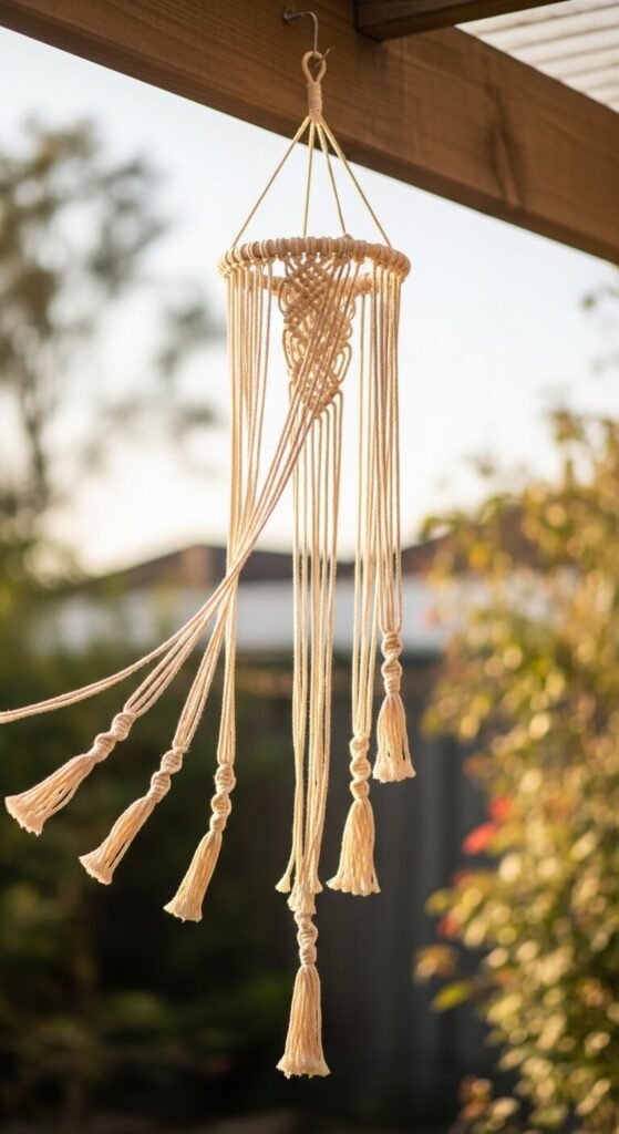 A macrame outdoor wind spinner hangs from a pergola beam, garden hook, or tree branch and moves with the breeze. A central wrapped wooden ring anchors strands of graduated length cotton cord, each ending in a small twisted tassel. Use outdoor-rated or wax-treated cotton cord to resist moisture and UV exposure. A single spinner uses about 20 meters of cord and costs under $12 to make. The gentle movement of the hanging strands in wind creates a quiet, meditative quality in a garden or porch space. Make several in the same cord color for a cohesive garden installation that costs very little and lasts a full outdoor season.