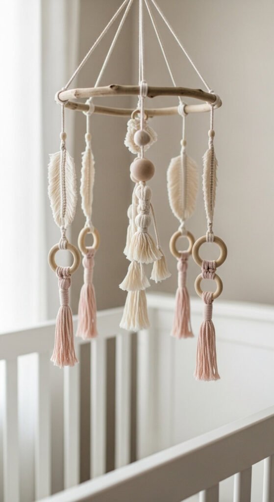 A macrame nursery mobile above a crib adds handmade warmth to a baby’s room without harsh colors or plastic materials. Use soft 1mm or 2mm cotton cord in natural cream or muted blush tones. Small macrame feathers, tassel drops, and looped cord rings hung at different heights from a driftwood or wooden dowel frame move gently in air currents. The full mobile costs under $20 in materials. Keep all hanging elements short enough that they remain well out of reach of the crib interior. This is a project best made by the parent — the personal meaning makes it even more special.