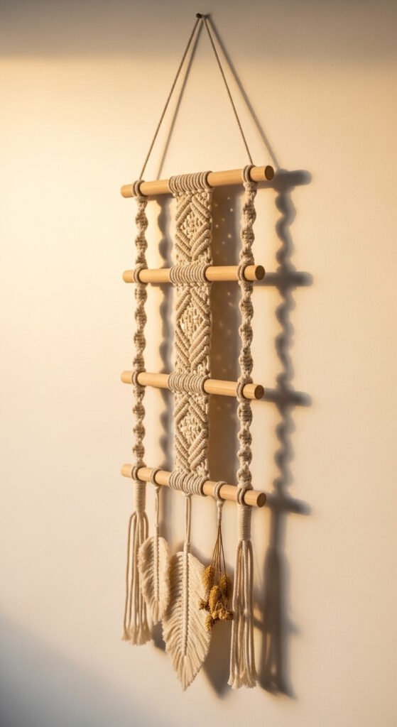 A macrame rope ladder mounted on a wall functions as sculptural decor rather than an actual ladder. The vertical rope sides and horizontal wooden dowel rungs create a strong geometric structure. Work square knot or spiral sections between each rung for additional texture. Hang small macrame feathers, dried botanicals, or crystal pendants from the lowest rung. The full piece uses five short wooden dowels and about 40 meters of 5mm cotton cord — materials cost under $20. Mount to the wall with two small hooks at the top. The structured geometric form works especially well against plain white or warm-toned walls.