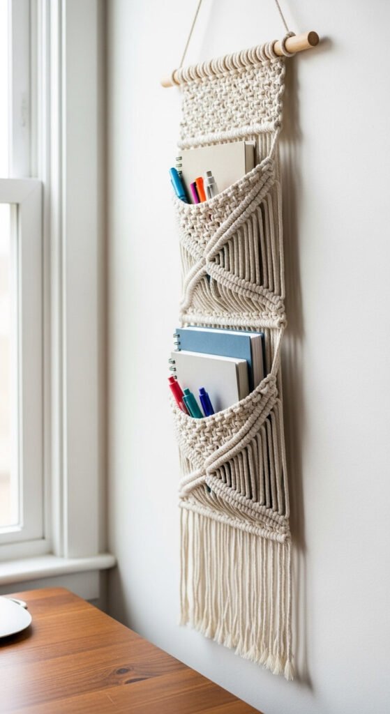 A macrame hanging pocket organizer solves a storage problem while looking like intentional wall decor. Three or four knotted cotton pockets hung vertically hold mail, notebooks, small plants, or art supplies without taking up desk or counter space. Each pocket is formed by folding a flat macrame panel and knotting the sides closed. The full organizer uses about 30 meters of 5mm cord and costs under $15 in materials. Mount on a wall beside a desk, in a kitchen beside the fridge, or in an entryway near the door. Form and function in a single handmade piece.