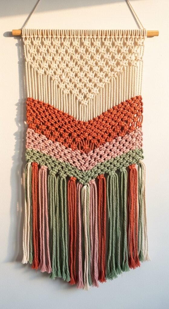 A colored macrame tapestry uses dyed cotton cord alongside natural rope to create a piece with visual warmth beyond the standard cream palette. Terracotta, dusty rose, sage green, and ochre are the colors that work best in boho interiors — they feel natural rather than synthetic. You can dye plain cotton cord at home using fabric dye for under $5 per color. Introduce color in horizontal bands or woven sections alternated with natural cord knot rows. The contrast between the natural and dyed sections draws the eye across the full piece. One or two accent colors are enough — more than three starts to compete.