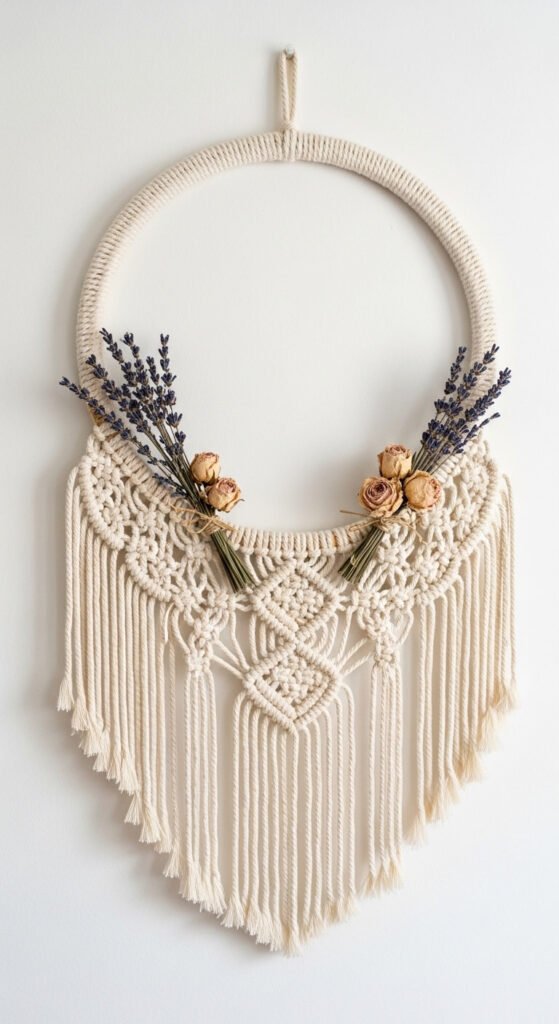 A macrame wreath on a wooden embroidery or willow hoop is a wall decor piece that works in every season. The knotted cotton base stays the same year-round — only the botanical additions change. Use dried lavender, eucalyptus, or cotton stems for a soft, natural look. A 14–16 inch hoop plus a ball of cotton rope costs about $12 in total. The finished wreath takes two to three hours for a beginner. Ready-made boho wreaths sell for $40–$80. Hang on a door, above a bed, or as part of a gallery wall where its round shape balances rectangular frames.