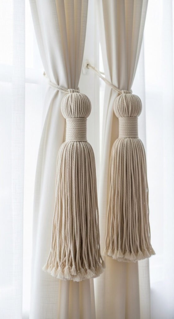 Macrame tassels used as curtain tiebacks replace generic metal brackets or plain fabric ties with something that has actual handmade character. Each tieback tassel takes about 20 minutes to make — cut rope into even lengths, bundle them together, and wrap the top with a spiral knot section. Two tassels cost under $8 in cord. Attach with a small curtain tieback hook screwed into the wall beside the window. The contrast of the thick textured tassel against crisp white linen is one of the most effective small decor details in a bohemian living room or bedroom.