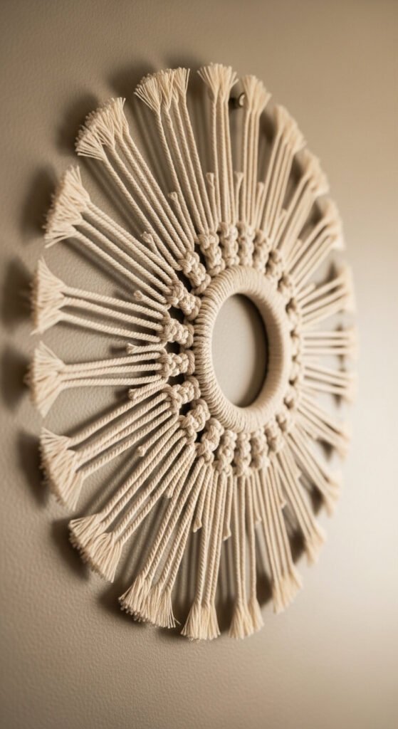 A macrame sunburst medallion is a circular wall piece that radiates outward from a central wrapped ring. Cotton cord strands are attached to the ring and spread evenly, knotted at intervals to hold the sunburst shape. The result is lighter and more delicate-looking than a full wall hanging. Make one using a metal ring from a craft store and 5mm cotton rope — materials cost under $12. The finished piece is about 18–22 inches in diameter. Hang one on its own as a standalone decorative object, or use three in different sizes as a grouped wall display.