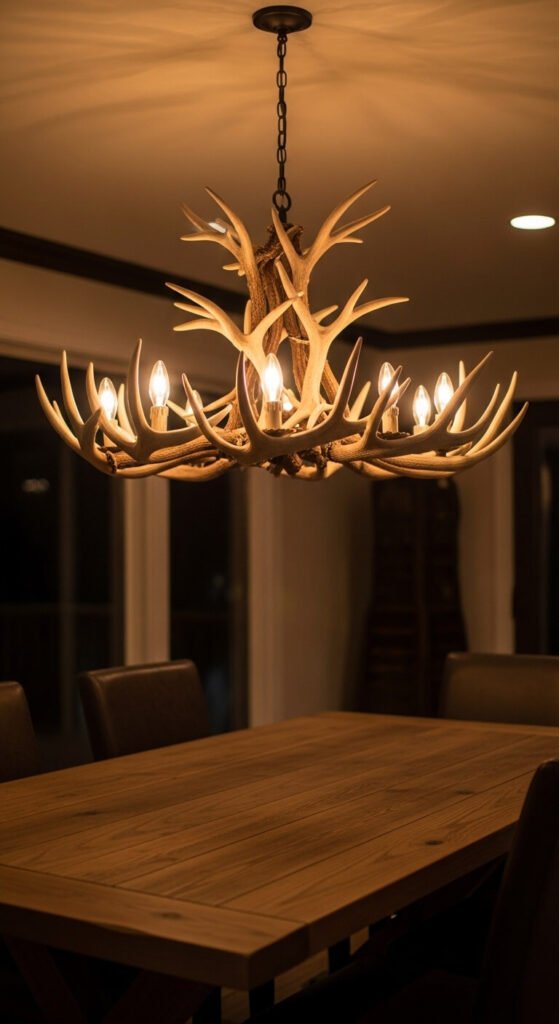 Mount antlers on plaques as wall art. Use them as curtain rod holders. Small antlers work as coat hooks—attach them to wood backing with screws. Antler chandeliers run $150-$500. For DIY versions, wire antlers together around a simple light fixture base. The natural ivory color and organic shapes bring wilderness indoors. Even urban apartments can pull off antler decor when paired with modern pieces. Clean them with a damp cloth. Leave the natural patina—don’t bleach or paint them.