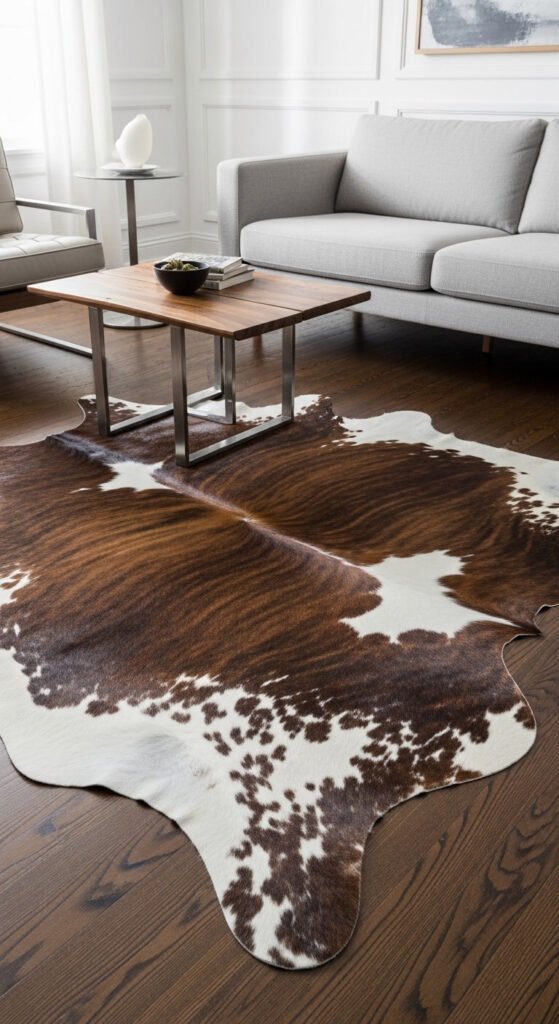 Vacuum regularly to remove dust. Spot clean spills with damp cloth and mild soap. The natural shape—no two are identical—breaks up the monotony of rectangular furniture. Layer cowhide over larger jute rugs for dimension. Drape smaller pieces over chairs or sofas. The pattern brings organic movement to spaces without feeling busy. Cowhide works in living rooms, bedrooms, and even home offices. The neutral colors coordinate with any palette while adding unmistakable rustic character.