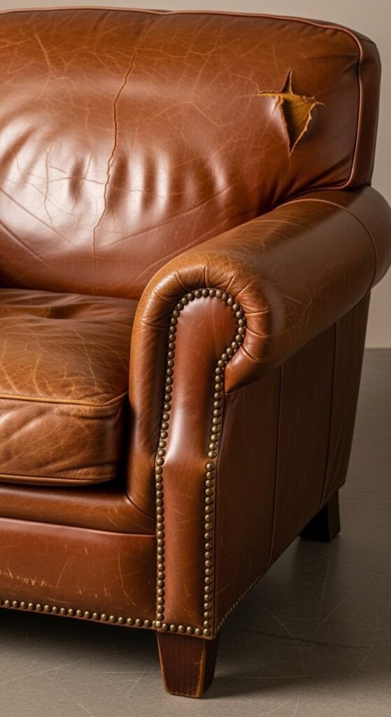Leather improves with age. Look for genuine leather pieces at estate sales and thrift stores for $100-$400. The distressing and patina make it more beautiful, not less.