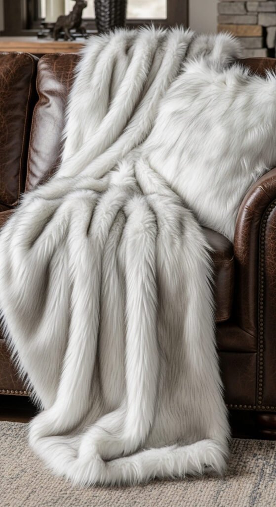 Drape throws over chairs or bed ends. The softness invites touching and creates instant comfort. Faux fur pillows add dimension when mixed with other textures. Machine wash on gentle and air dry to maintain fluffiness. The plush material contrasts beautifully with rough wood and metal. It softens rustic spaces that might otherwise feel too hard-edged. One faux fur throw per seating area creates approachable warmth. Guests always gravitate toward these pieces. They’re also pet and kid-friendly since they wash easily.