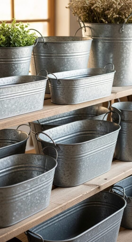 Use buckets as planters—drill drainage holes in the bottom. Ice buckets become utensil holders in kitchens. Small buckets organize desk supplies. The metal reflects light subtly and contrasts with warm wood tones. Look for vintage pieces at flea markets for more character. New galvanized items work too. The material is waterproof and sturdy. Create tiered plant stands using different sized buckets. The cool metal tones balance warm rustic elements. Industrial meets farmhouse perfectly in galvanized pieces.