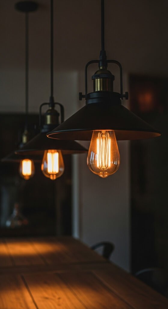 Hang them over kitchen islands, dining tables, or in hallways. Use Edison bulbs for warm vintage glow. The simple shapes don’t compete with rustic textures. Install dimmer switches to control ambiance. Multiple pendants at staggered heights create visual interest. The metal reflects light while the open bottom directs it downward. These fixtures bridge rustic and industrial styles perfectly. Moody atmospheric lighting that’s practical and beautiful. Mix finishes—black with brass accents—for custom looks.