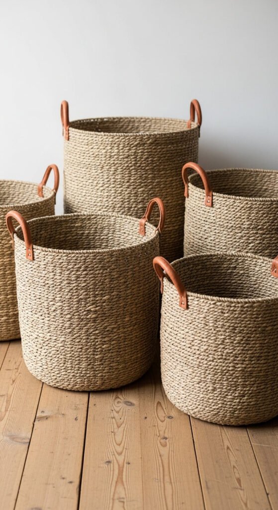 Use them for blanket storage in living rooms. Corral toys in kids’ rooms. Store towels in bathrooms. The texture adds warmth while keeping spaces tidy. Large baskets work as planters for big houseplants—set the plastic pot inside the basket. Group three different sized baskets together for visual interest. The neutral tones work with any color scheme. Unlike plastic bins, woven baskets improve with age. They develop patina and character. Functional beauty that organizes your life and looks good doing it.