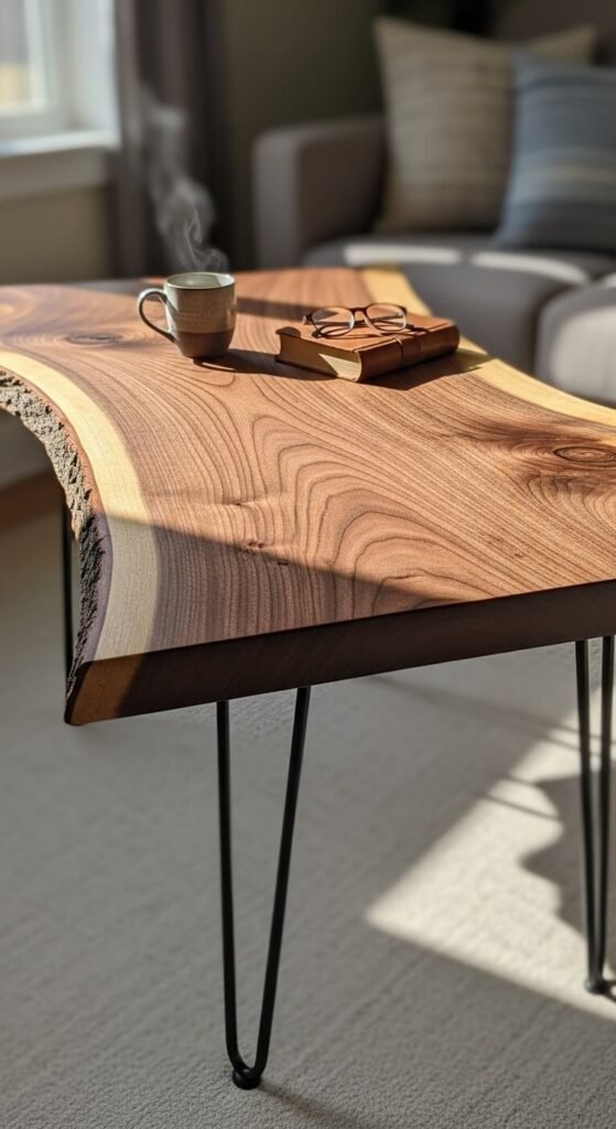 Sand the top smooth but leave the live edge natural. Seal with polyurethane for protection. Attach hairpin legs ($30-$60 for a set) or make simple frames. The organic edge brings nature indoors literally. Each piece is unique. Walnut, maple, and cherry are popular choices. For budget versions, look for damaged slabs with cracks—fill cracks with colored epoxy for custom effects. The irregular edge contrasts beautifully with straight furniture lines. One live edge piece anchors a room’s rustic style.