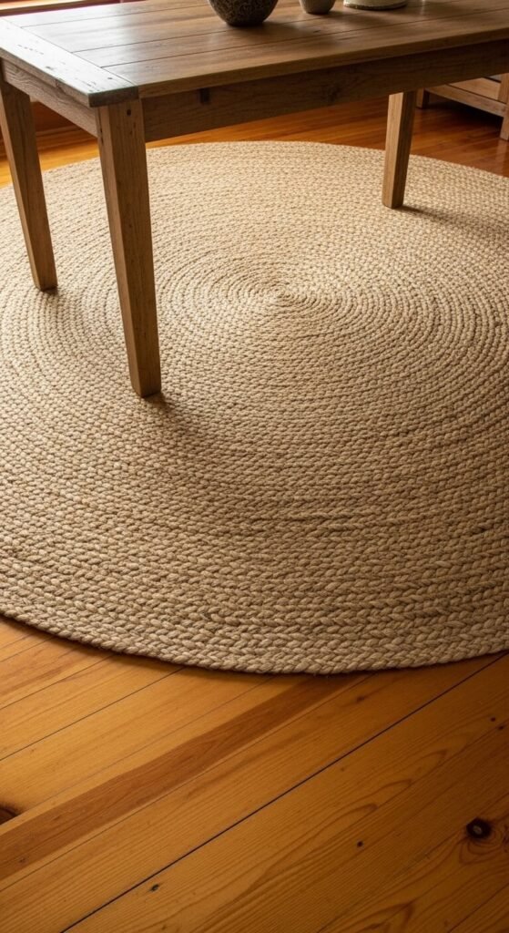 Jute, sisal, and seagrass rugs cost $80-$300 depending on size. They’re incredibly durable and add instant texture. The neutral tones anchor rooms without competing for attention.