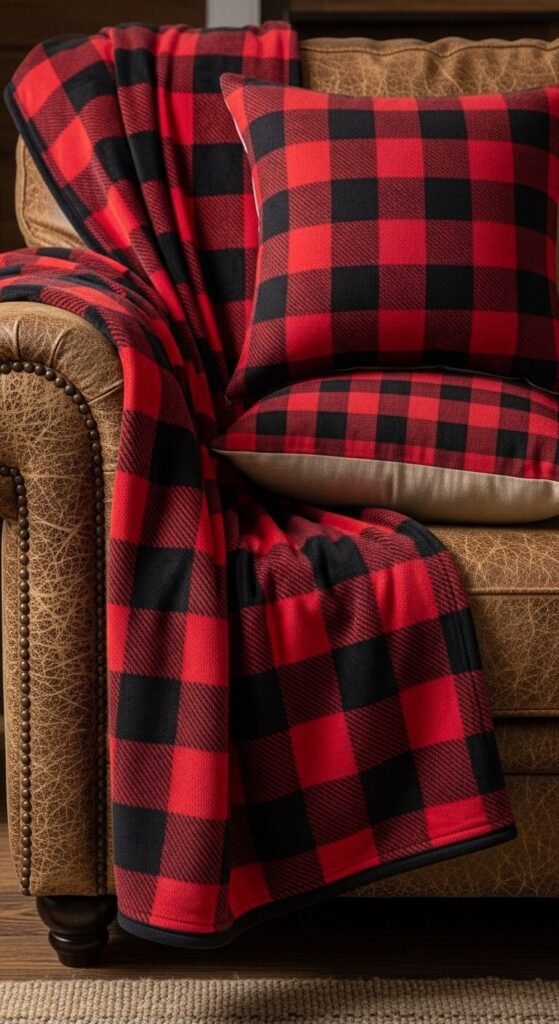 Plaid brings instant cabin vibes. Buffalo check—large black and red or black and white squares—is the most recognizable. Buy throw blankets for $20-$40 or make pillow covers from $8/yard flannel.