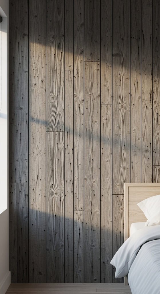 Sand the wood lightly to remove rough spots but keep the weathered finish. Attach planks directly to drywall using a nail gun or construction adhesive. Stagger the boards for a random, organic look. Some people whitewash the wood—mix one part white paint with three parts water, brush on, wipe off excess. Others leave it natural. The varied tones and textures add dimensional warmth that paint can’t match. One accent wall behind your bed or sofa transforms the whole room for under $100 in materials.