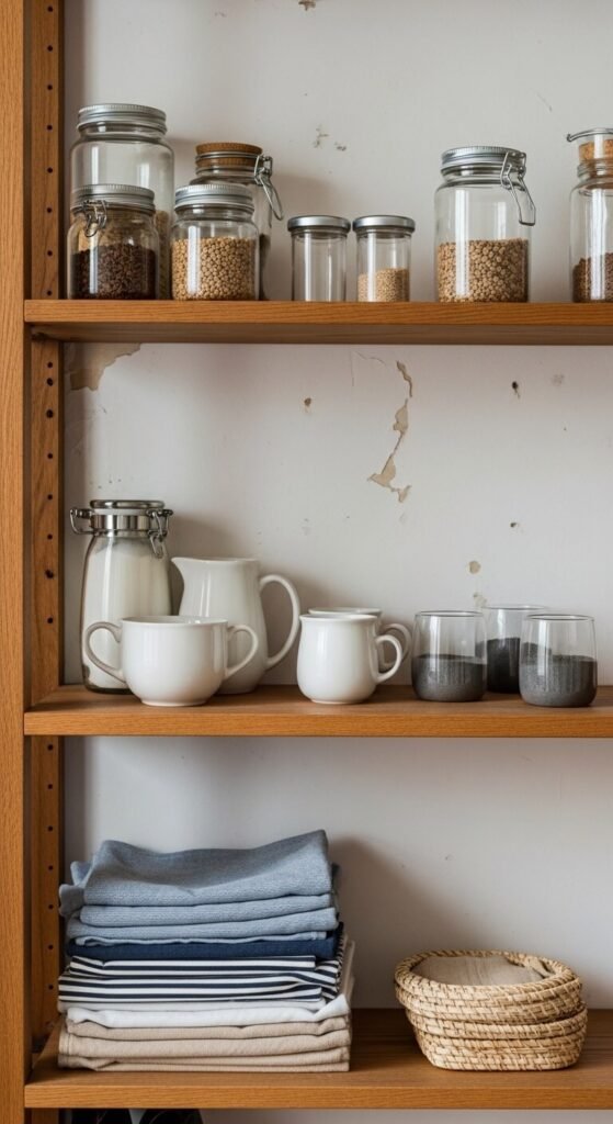 Secure crates to wall studs using L-brackets inside where they won’t show. Arrange four crates in a square, six in a rectangle. Leave some compartments open, some backed with fabric or colored paper. The varied wood tones and visible grain create interest. Use crates to display books, plants, photos, or collections. Change contents seasonally. The modular design means you can rearrange or add more anytime. Flexible rustic storage that costs almost nothing to implement.