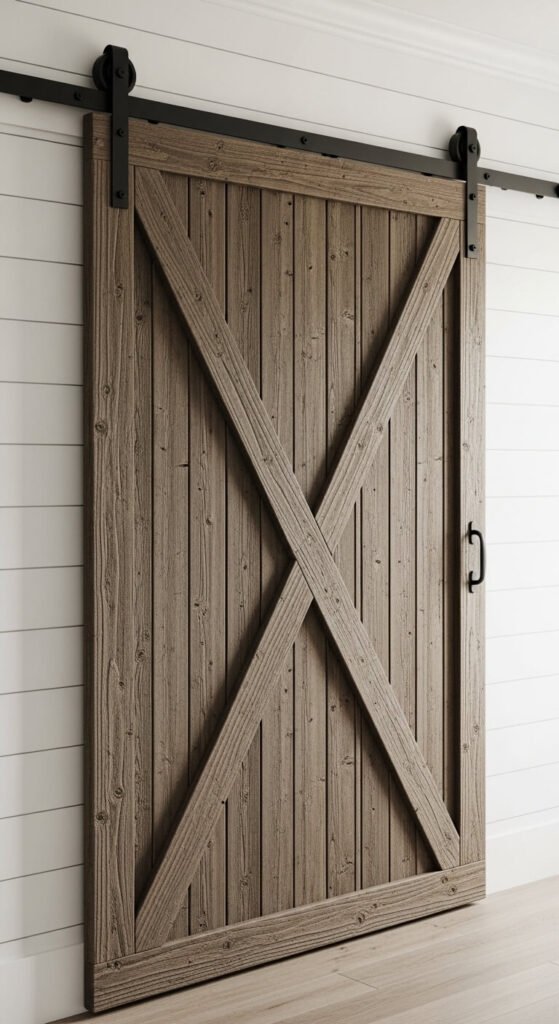 Install track hardware on the wall above your doorway. Hang the door, adjust rollers for smooth sliding. Barn doors work great for bathrooms, closets, and between living spaces. The sliding mechanism means no swing clearance needed. Choose natural wood, painted wood, or whitewashed finishes. The horizontal planks and visible hardware create statement architecture on otherwise plain walls. Even interior doors get the rustic treatment this way. Watch installation videos online—it’s a manageable weekend project.