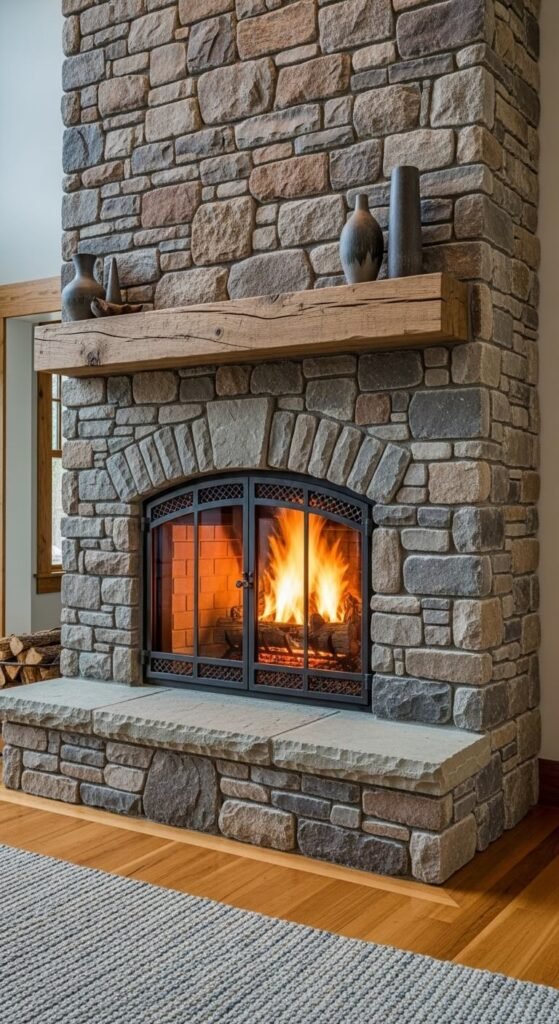 Apply mortar to the back, press panels to the wall, let dry. Cut pieces with a wet saw (rent one for $50/day). The irregular shapes and natural colors create a cabin feel instantly. Choose river rock for smooth texture or stacked stone for defined lines. Gray, tan, and rust tones work everywhere. If you can’t afford the whole fireplace, do the hearth and lower third. That’s where eyes naturally focus. Stone adds permanent warmth and value to your home.