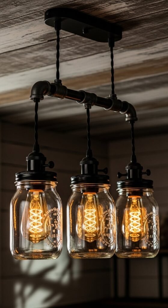 Mason jars cost $1-$2 each at thrift stores. Pendant light kits run $12-$18 at hardware stores. Combine them for custom lighting under $50 total.