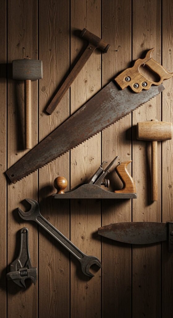 Mount saws, planes, hammers, and wrenches directly on walls or on wooden backing boards. Arrange them symmetrically or randomly depending on your style. The metal and wood textures add masculine rustic character. Tool displays work in workshops, garages, home offices, or man caves. Leave tools as-is or clean lightly with steel wool. Some people paint handles for color pops. The authenticity of real working tools beats decorative replicas. History on your walls that celebrates craftsmanship. Guests always ask about the stories behind them.