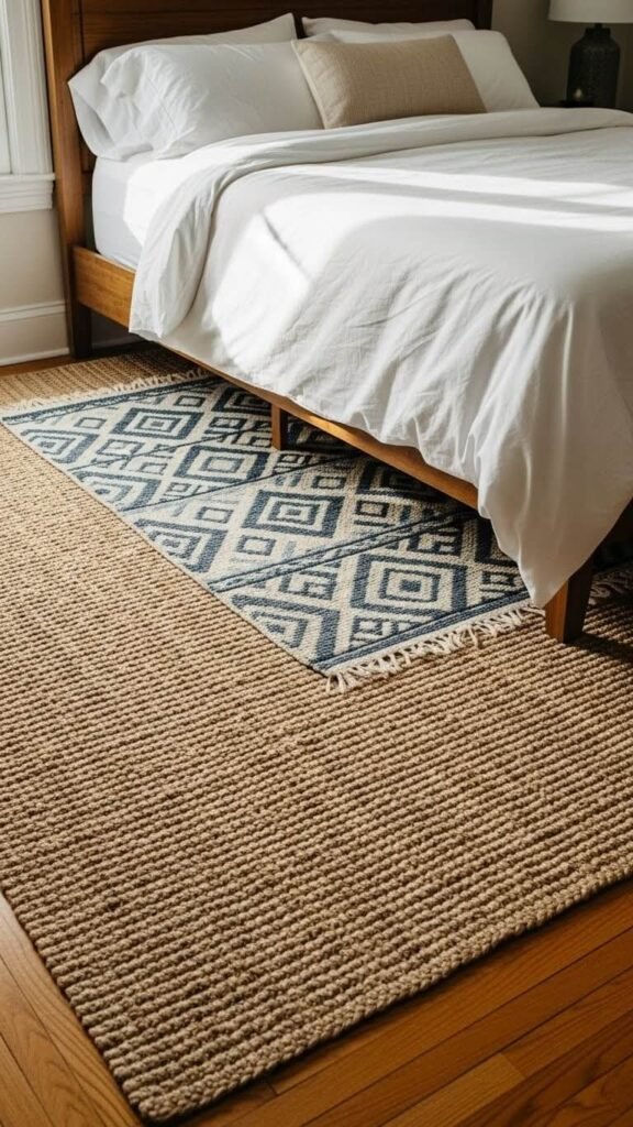 Bare floors feel cold and echo. Add a rug that extends 18-24 inches beyond your bed on three sides. This grounds your furniture and softens footsteps. Jute rugs are affordable and timeless. Layer a smaller patterned rug on top for dimension. Rugs USA and Wayfair run sales constantly—snag 8x10s for under $100. Vacuum weekly to prevent dust buildup. Rug pads prevent slipping and extend rug life.