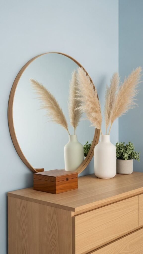 Dressers shouldn’t be dumping grounds. Create a triangle composition with three items: a mirror, a plant, and something tall like a vase. Vary heights and group objects. Use a decorative tray for jewelry and daily items. Keep 40% of the surface empty so it doesn’t look cluttered. Swap seasonal items—pussy willows in spring, pinecones in winter. This intentional styling takes five minutes but looks designer. Your room feels curated, not chaotic.