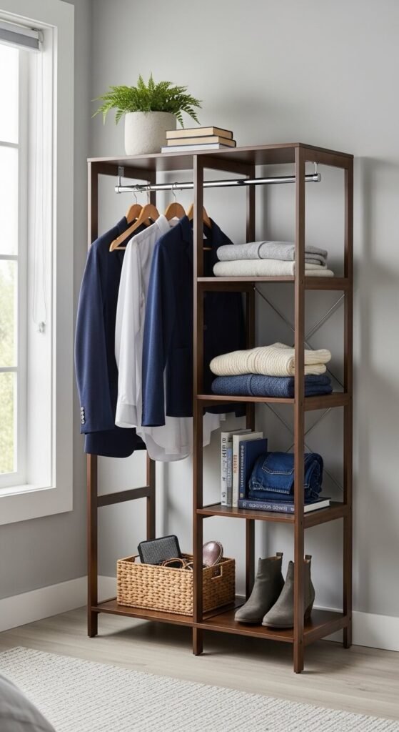 Position them in bedrooms or hallways for overflow clothing. The portable organization supplements tiny rental closets. Some include covers for dust protection. Wheels let you move them for cleaning or rearranging. Tension rods inside create double-hang sections. These work as guest closets or seasonal storage. Disassemble them for moving. This is clothing storage that isn’t permanent. Take your closet expansion with you when you leave.