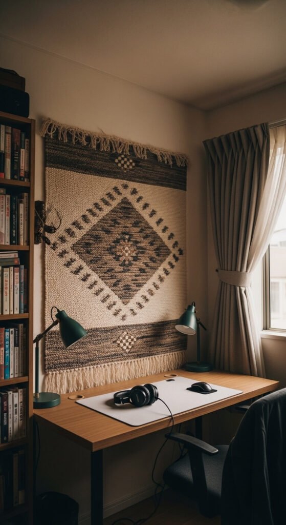Background noise is a hidden productivity thief. Hard walls and bare floors bounce sound around the room. Soft furnishings absorb noise — thick curtains, a large area rug, bookshelves filled with books, and even a wall tapestry all help. These don’t have to be expensive. A thrifted rug, curtains from IKEA, or a macramé wall hanging can all reduce echo noticeably. Pair with a pair of noise-cancelling headphones or lo-fi music when the environment still isn’t quiet enough.