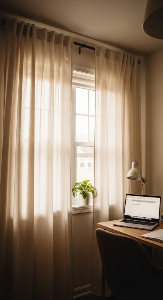 Too much direct sunlight causes screen glare and makes any room feel uncomfortably warm. Light-filtering or blackout curtains give you control over your environment at any time of day. Linen or cotton curtains diffuse light without blocking it entirely — great for daytime work. Blackout curtains are better if you work video calls or late evenings. Both options run $15–$40 per panel at most home goods stores. Curtains also add softness and texture to a space, making it feel more finished.