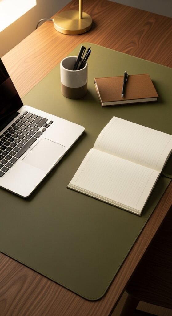 A desk mat does three things at once: protects your desk, contains visual clutter within a defined area, and adds texture and warmth to your workspace. A large desk mat (or “deskpad”) acts as a visual anchor for all your tools. Cork, faux leather, and felt options range from $15–$35. Everything placed on the mat feels intentional. It also makes the desk look finished and put-together with almost no effort — important for video calls and your own daily visual experience.