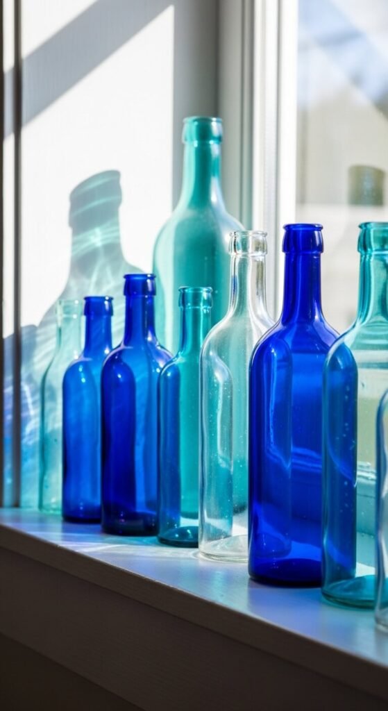 Colored glass bottles—especially blues and aquas—filter light beautifully. Find them at antique shops for $5-$15 each or buy reproductions for less. The transparent color brings ocean tones directly into spaces.