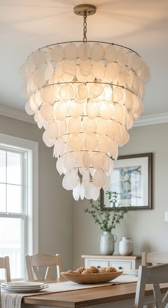 Capiz shell chandeliers catch and refract light beautifully. The layered shells create organic texture and gentle movement. Fixtures range from $100-$500 depending on size and intricacy.