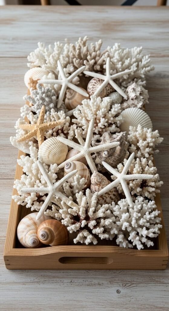 Buy coral pieces at craft stores for $8-$25 or collect shells yourself. Arrange them in groups of three or five. The odd numbers feel more organic. White coral against dark wood creates dramatic contrast. Mix textures—smooth shells with rough coral with spiky urchins. Clean collected shells by soaking in bleach water, rinsing thoroughly, and air-drying. Display on bathroom counters, coffee tables, or bookshelves. The natural beach specimens tell stories and add dimension. Rotate collections seasonally to keep displays feeling curated.