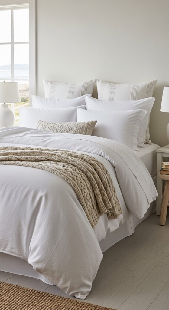 All-white bedding feels clean and coastal. Layer different textures—smooth cotton sheets, nubby linen duvet, cable knit throw, eyelet pillows. The variation creates depth without color.